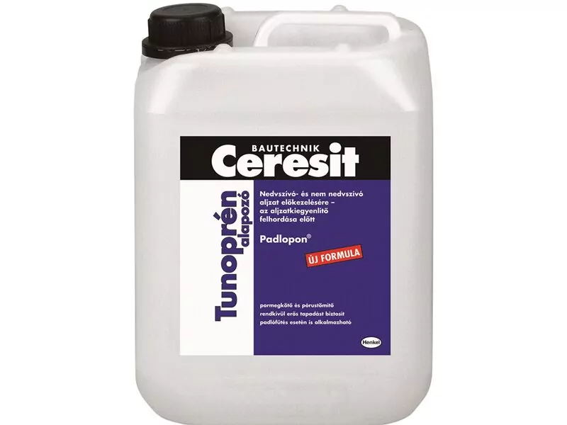 AZ ALJZAT ELKÉSZÍTÉSEAz aljzatnak tartósan száraznak, tisztának, repedésmentesnek, megfelelő húzó- és nyomószilárdságúnak kell lennie. Ha a felületen puha vagy gyengén tapadó ragasztómaradvány talál-ha tó, el kell távolítani. Gipszesztrich esetén a felületet addig kell csiszolni (16-os korong), amíg az adalékszemcsék nem látszanak! A kő és járólapokat alapozás előtt tisztítsuk meg az esetleges olaj- és zsírfoltoktól, piszoktól.FELHORDÁSA Ceresit Padlopon® Tunoprén alapozót használat előtt alaposan rázzuk fel. Nedvszívó aljzat esetén: a hígítatlan alapozót egyenletesen hordja fel a betonaljzat felületére szivacshenger segítségével. A túl porózus, erősen szívó felületet javasolt kétszer alapozni! Cementesztrich és gipszesztrich esetén az alapozó 1:1 arányban hígítható. Száradási idő: lásd a műszaki adatoknál.Tömör, nem szívó aljzat esetén: a hígítatlan alapozót szivacs-henger segítségével, vékonyan, tócsaképződés nélkül kell felhordani. Az alapozó teljes száradása után (kb. 6 óra) kezdhető meg a megfelel Ceresit vagy Thomsit aljzatkiegyenlítő fel hordása